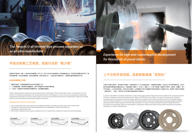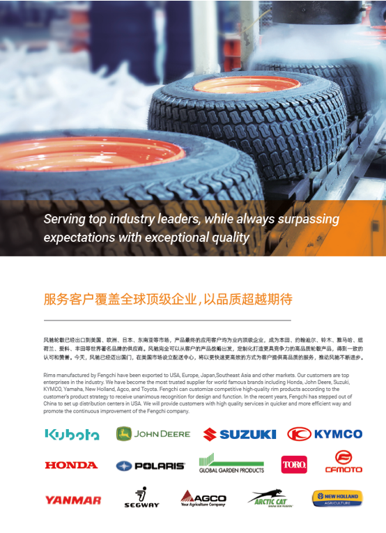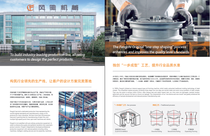 浙江風(fēng)馳機(jī)械有限公司,成立于1994年,伴隨著時間的飛逝,一直以工匠精神專注生產(chǎn)非公路低速車輛輪轂,在董事長潘衛(wèi)民的英明帶領(lǐng)下,風(fēng)馳以自信、沉穩(wěn)、堅實的腳步,企業(yè)逐步成為了世界500強(qiáng)合作伙伴、申請了企業(yè)獨有的輪輞品牌、創(chuàng)立了旗下5家子公司、獨創(chuàng)特殊工藝、產(chǎn)品革新?lián)Q代,一直以實現(xiàn)“引領(lǐng)低速車輪發(fā)展,為中國制造正名”的使命及成為“全球知名低速車輛制造企業(yè)的最佳戰(zhàn)略合作伙伴”為愿景而一直努力著。