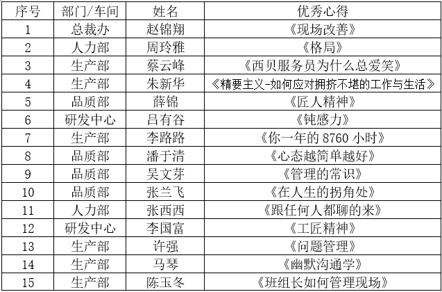 本次為第四季度讀書心得評選活動,經(jīng)總裁辦校對、審核,從100多篇心得中初選出30篇,再根據(jù)主題明確、立意新穎、結(jié)合工作實際、文字通順完整等篩選出16篇優(yōu)秀心得,其中獲得本季度“最佳讀書心得”得主是生產(chǎn)部潘靈橋《不會帶團(tuán)隊,你就只能干到死》。其余優(yōu)秀文稿如下: