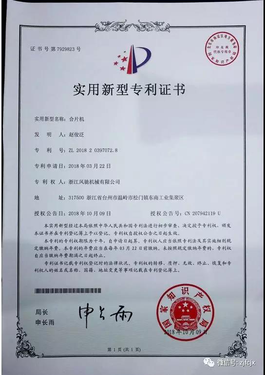 2018年11月榮獲臺州市知識產權局頒發(fā)的“臺州市專利示范企業(yè)”
