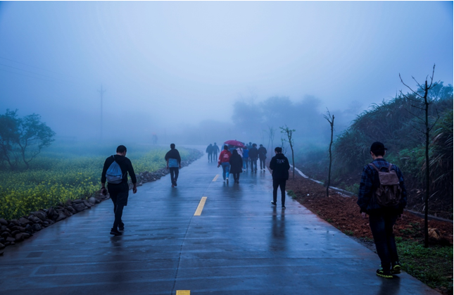 在各組成員吃飽喝足充滿能量之后 ,開(kāi)始了此次活動(dòng)最高潮部分——暴走。在開(kāi)始暴走之前,參加暴走的全體成員在自行車協(xié)會(huì)牌前集合進(jìn)行了合影留念,之后開(kāi)始了暴走活動(dòng)。天氣依然是跟早上一樣,三米開(kāi)外的地方,似乎什么都看不清了,天空中也下著蒙蒙細(xì)雨,但一點(diǎn)也不影響我們的心情。大家一邊歡快地聊著天,一邊向上地攀登者。享受著霧蒙蒙的風(fēng)景,在這詩(shī)情畫(huà)意中繼續(xù)著。很快我們從平坦的水泥路轉(zhuǎn)到了泥濘的山路中。疊翠的峰巒、茂密的森林和曲折盤(pán)旋的山路讓我們不禁陶醉其中,盡情領(lǐng)略大自然的風(fēng)情。各個(gè)部門(mén)之間都彼此相互鼓勵(lì)、相互協(xié)助,不斷挑戰(zhàn)著自己。